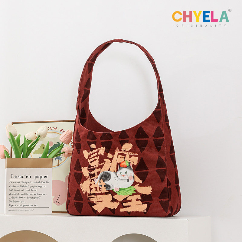 采绎来x树一复古单肩包富瘦双全小众原创猫咪大容量帆布包包QT698