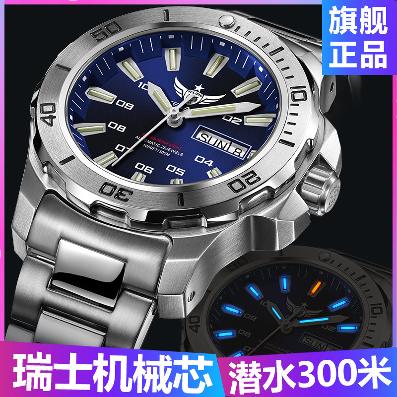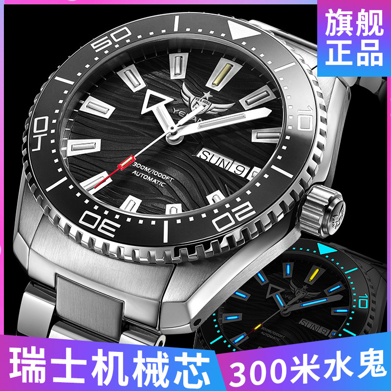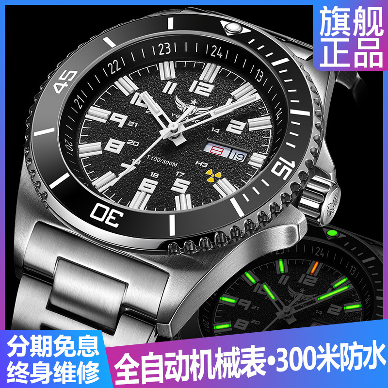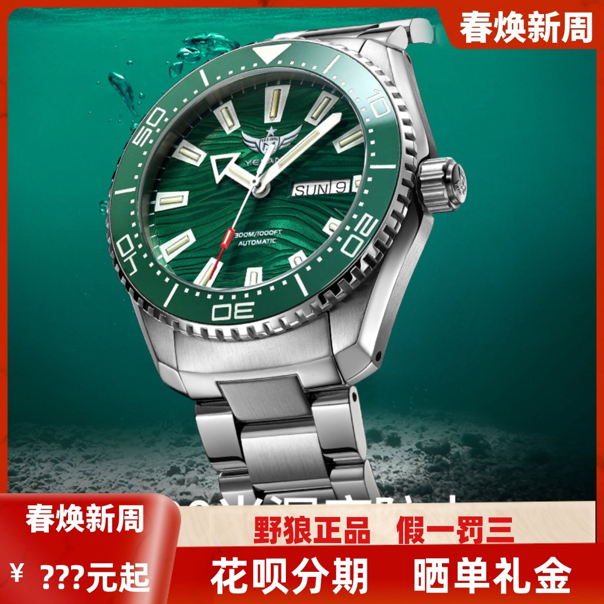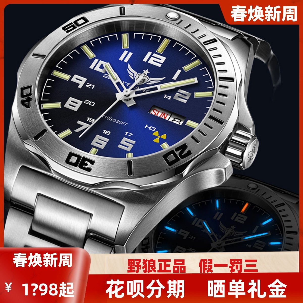 官方正品野狼手表旗舰300米防水全自动瑞士水鬼氚气机械表男品牌