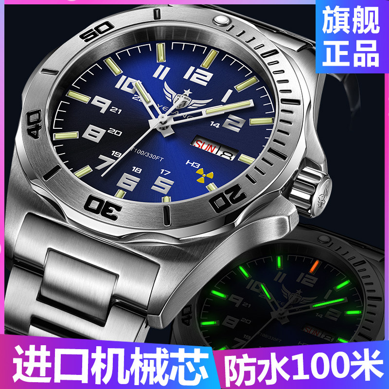 野狼军氚气手表男全自动机械表游泳防水水鬼夜光运动蓝宝石V1019