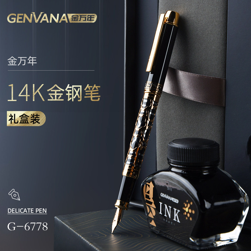 金万年14K金钢笔高档礼盒装男女士商务办公套装成人送礼镀金墨水笔书法练字笔黑色签字笔宝珠笔精致金笔水笔