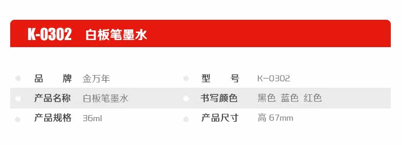 金万年K-0302白板笔通用墨水白板笔水补充液填充液36ml黑/蓝/红色