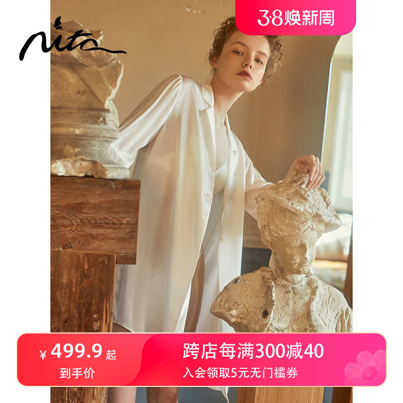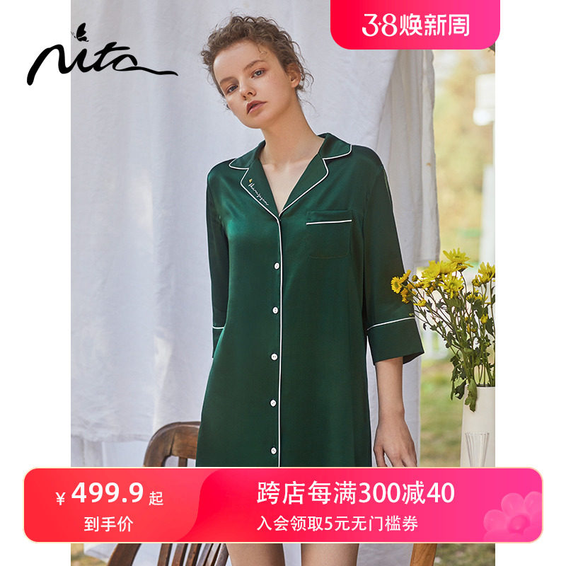 Nita妮塔真丝睡裙女法式男朋友风衬衫裙简约优雅抽皱袖丝绸家居服
