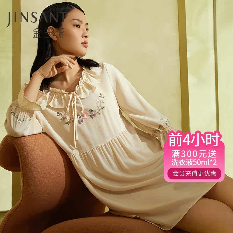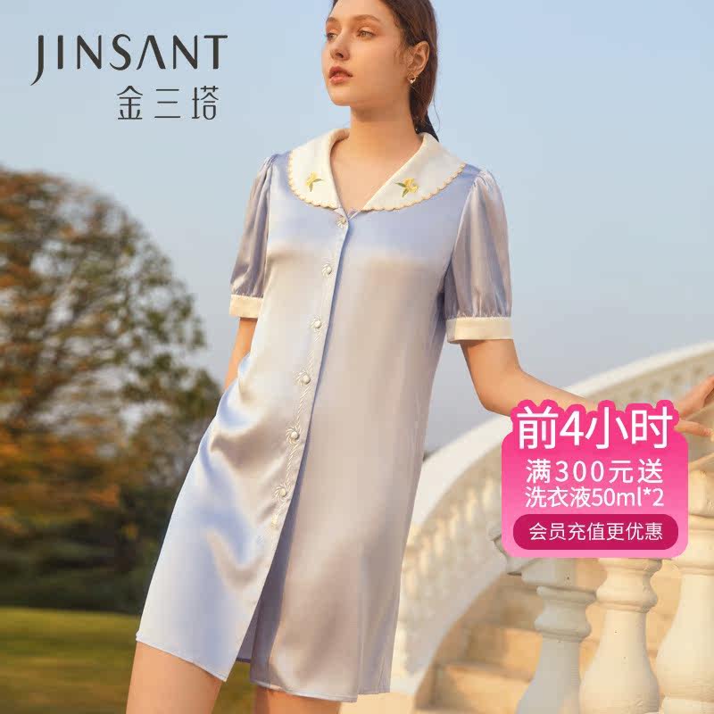 金三塔100%桑蚕丝睡裙女蓝铃草刺绣娃娃领真丝睡衣丝滑舒适家居服
