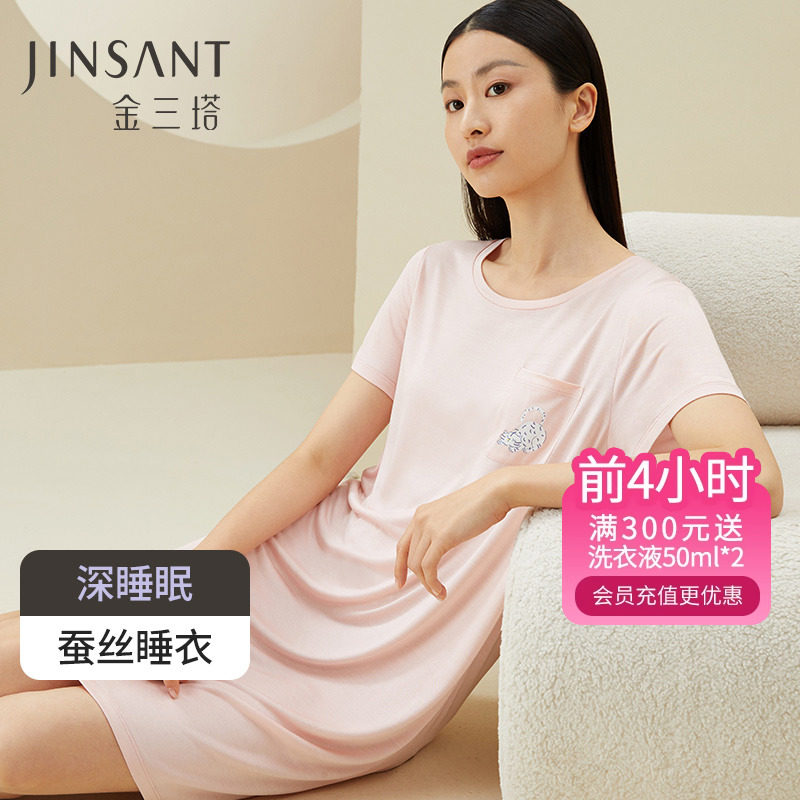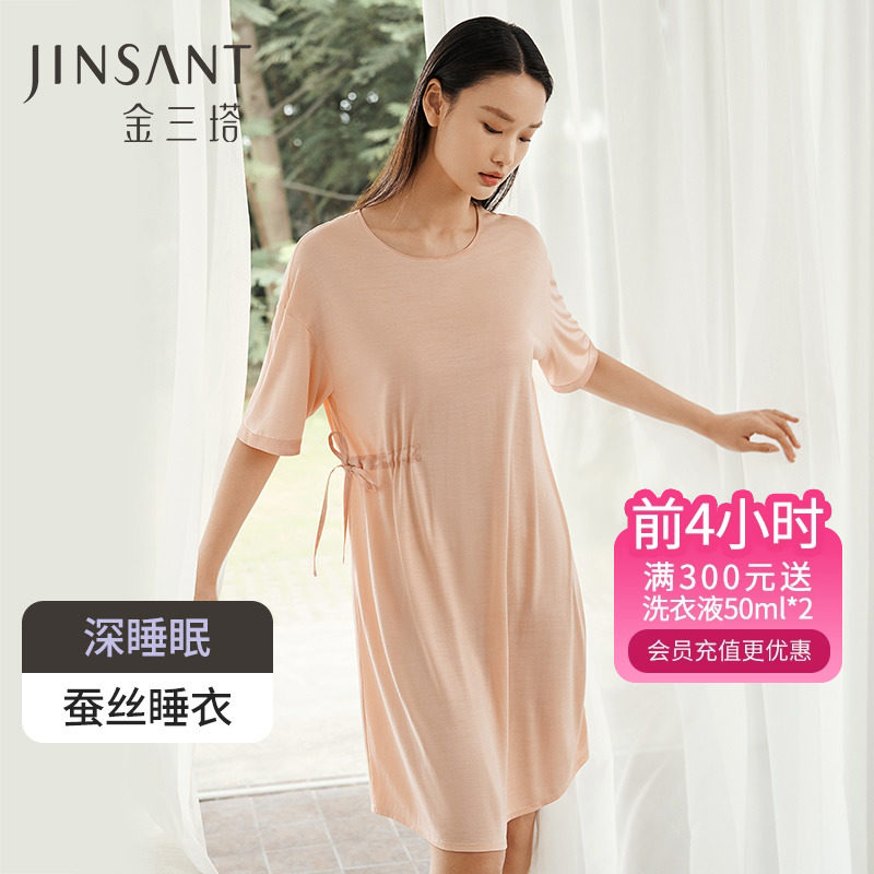 金三塔舒适丝滑真丝圆领短袖可外穿睡裙女 桑蚕丝纯色睡衣女