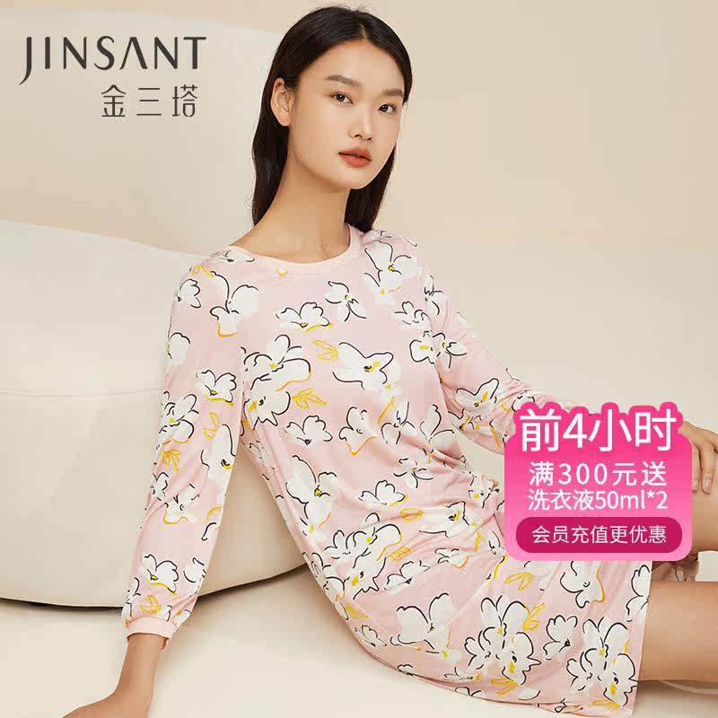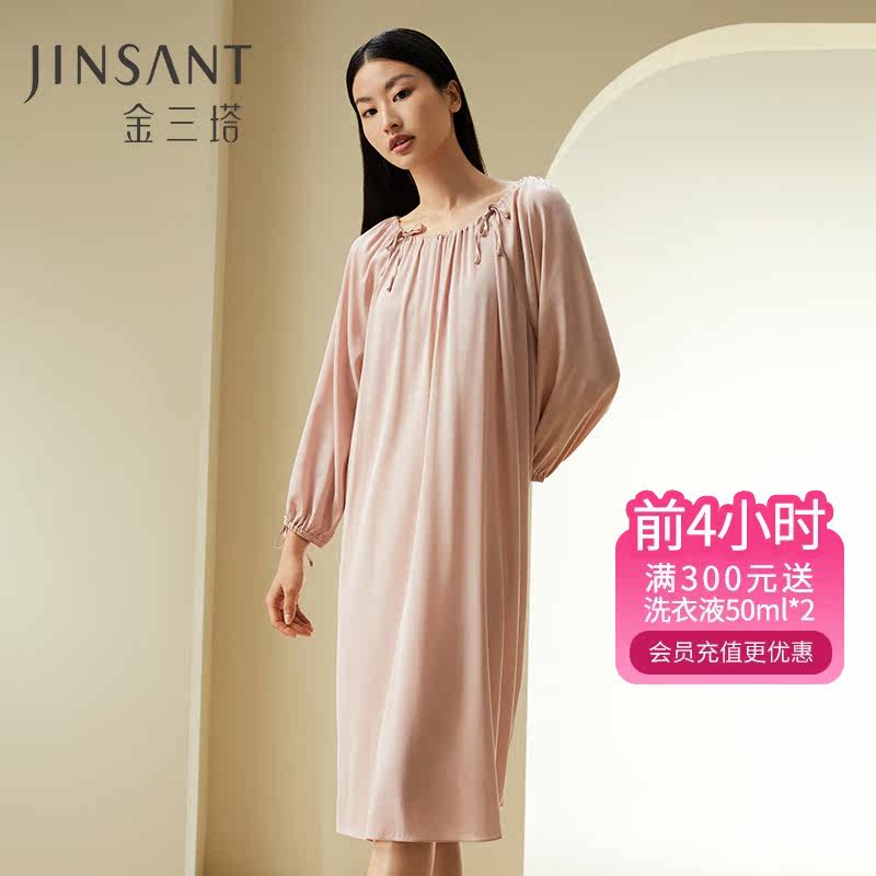 金三塔春夏圆领领真丝长袖简约纯色家居服女宽松亲肤舒适睡裙