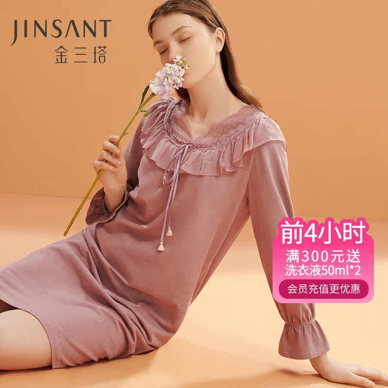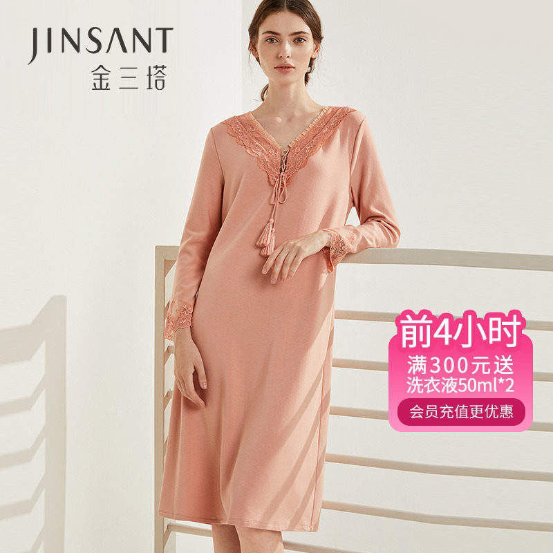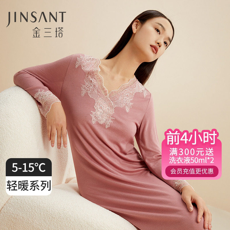 金三塔桑蚕丝&羊毛 温暖轻盈 舒适亲肤女士拼蕾丝优雅睡裙居家服