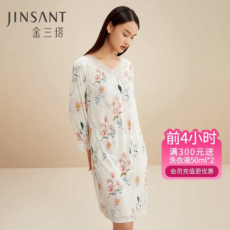 金三塔100%桑蚕丝真丝针织舒适好眠女拼蕾丝繁华之名印花睡裙睡衣