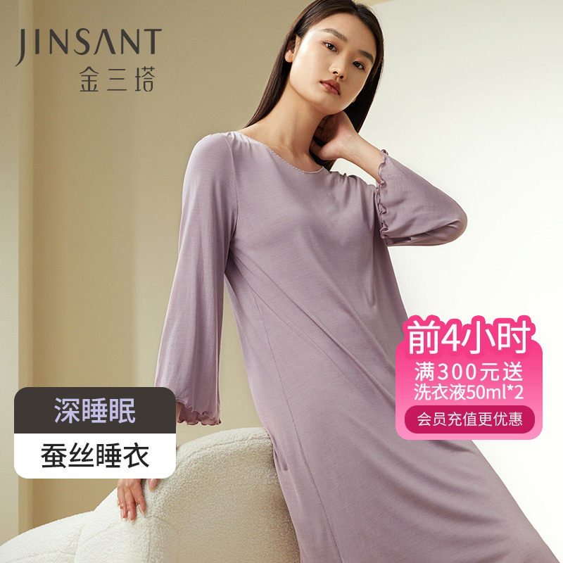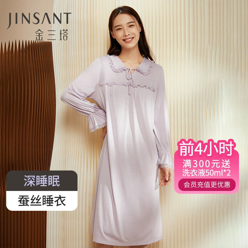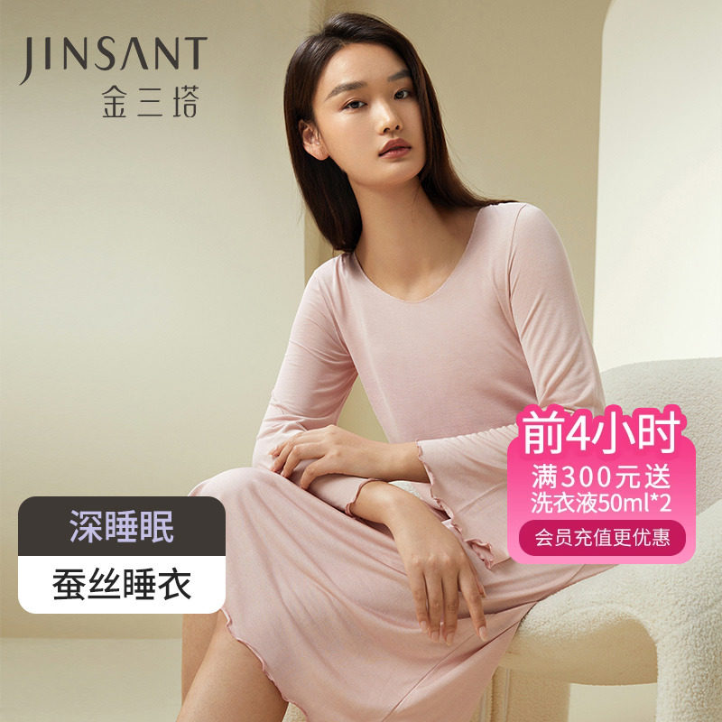 深睡眠蚕丝睡衣】真丝针织睡衣100%桑蚕丝女长袖睡裙家居服金三塔