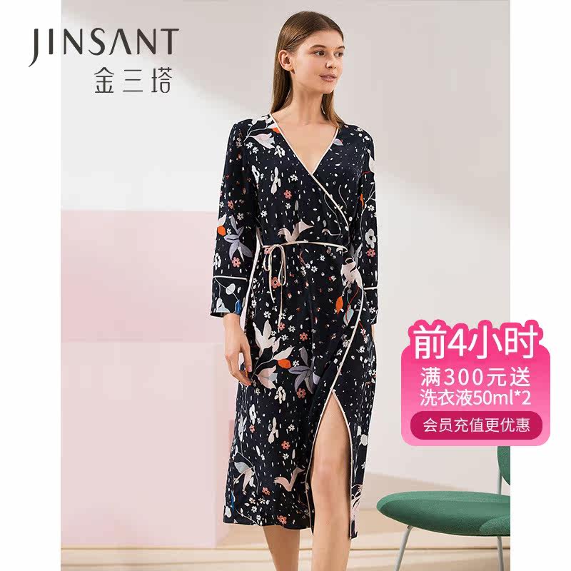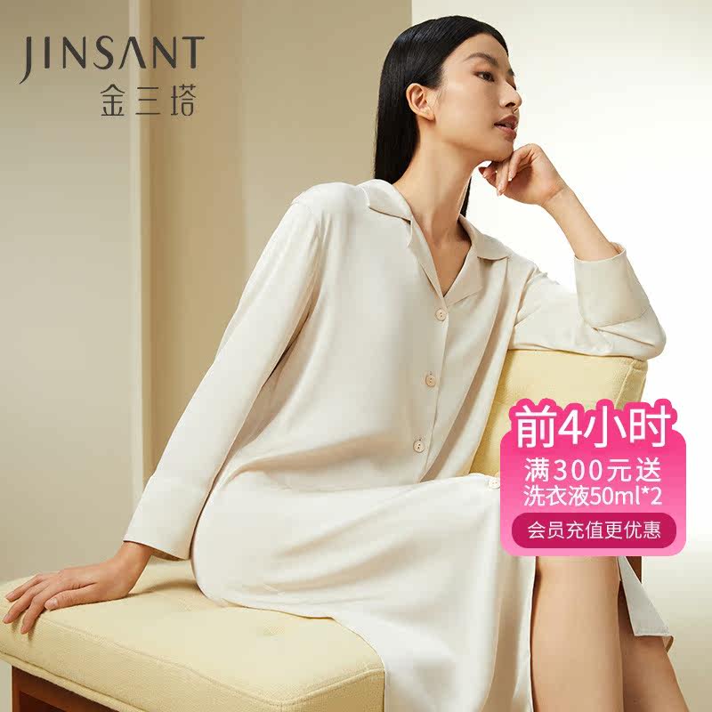 裙/袍两穿】金三塔100%桑蚕丝衬衫式睡裙/袍舒适时尚家居服新品