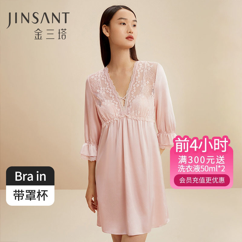 金三塔100%桑蚕丝舒适免穿文胸女士真丝brain带胸垫睡裙家居服