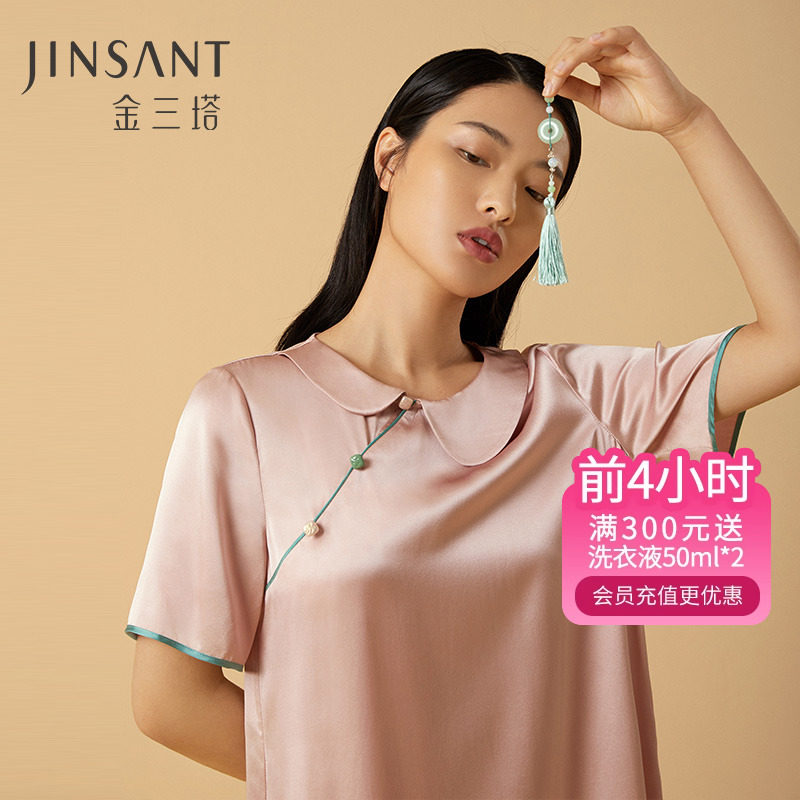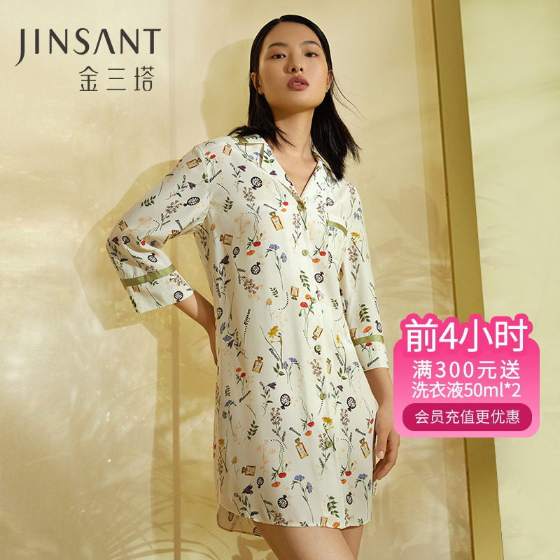 金三塔100%桑蚕丝 舒适亲肤 小香风衬衫式女士真丝翻领睡裙家居服