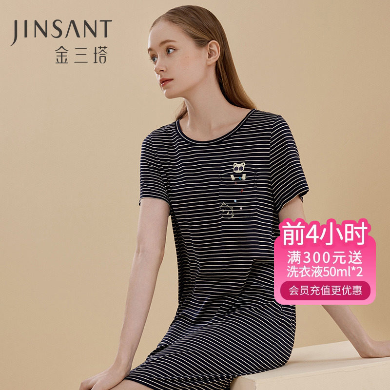 金三塔100%真丝针织 可爱猫咪印花 条纹短袖睡裙家居服 新品