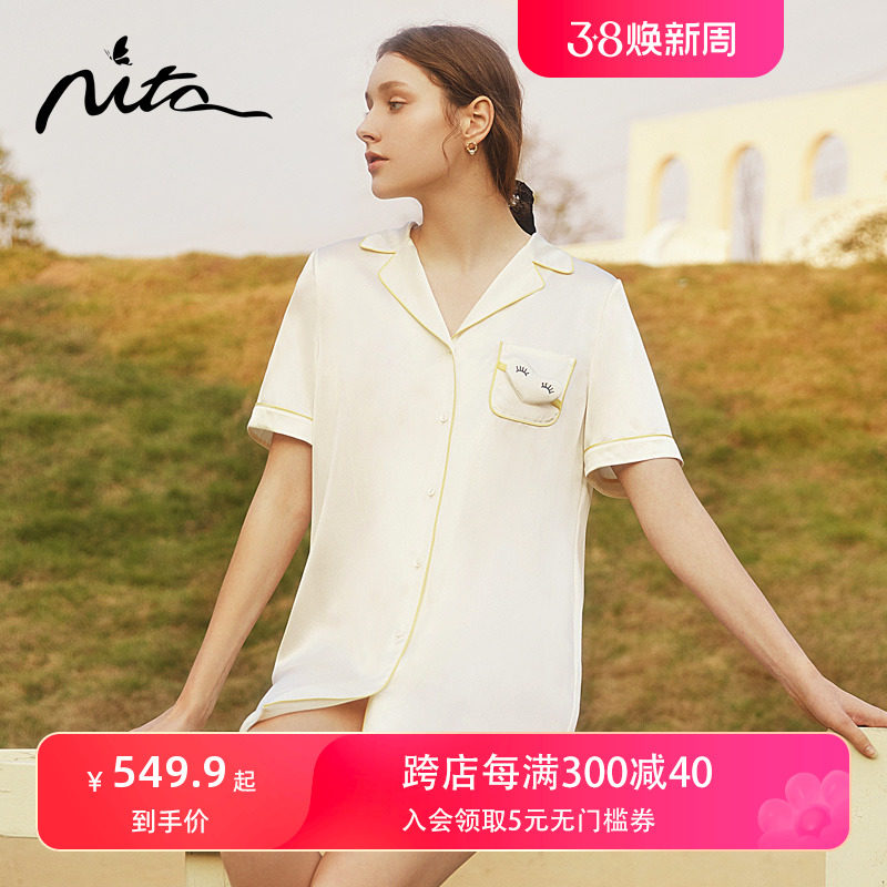 Nita妮塔法式翻驳领短袖真丝睡裙爱心装饰100%桑蚕丝短裙家居服