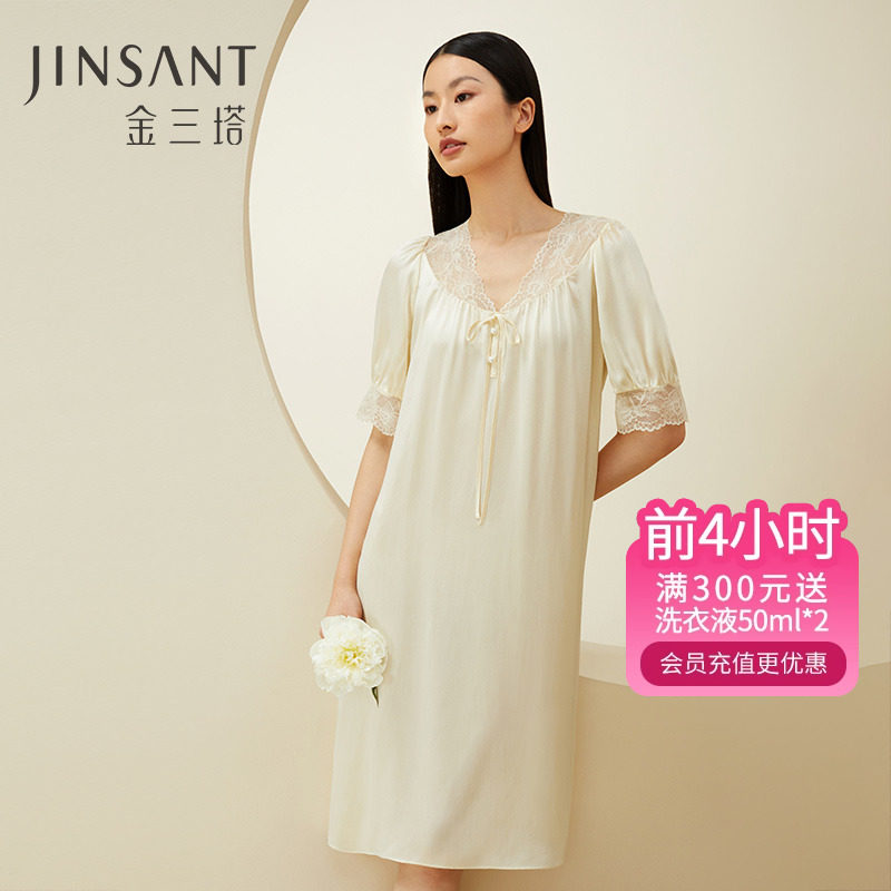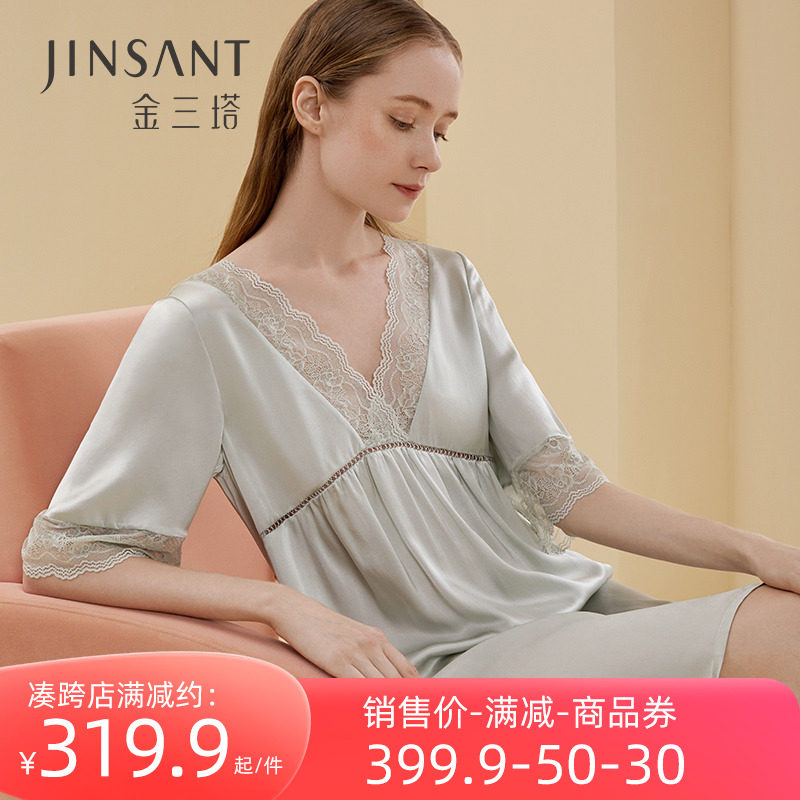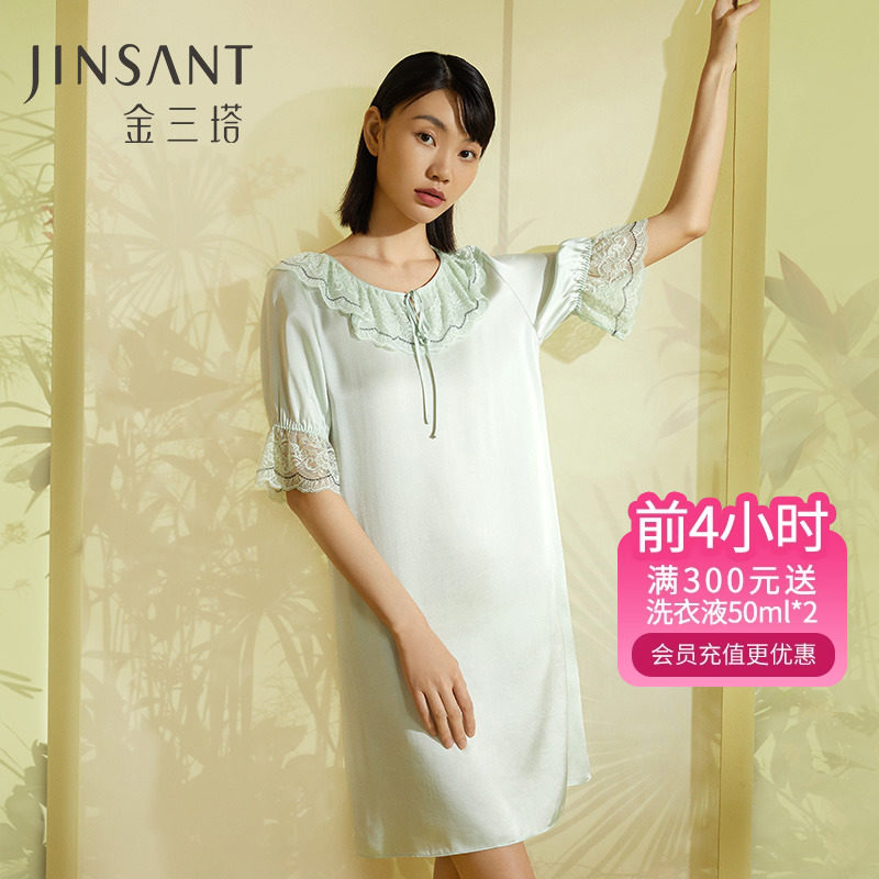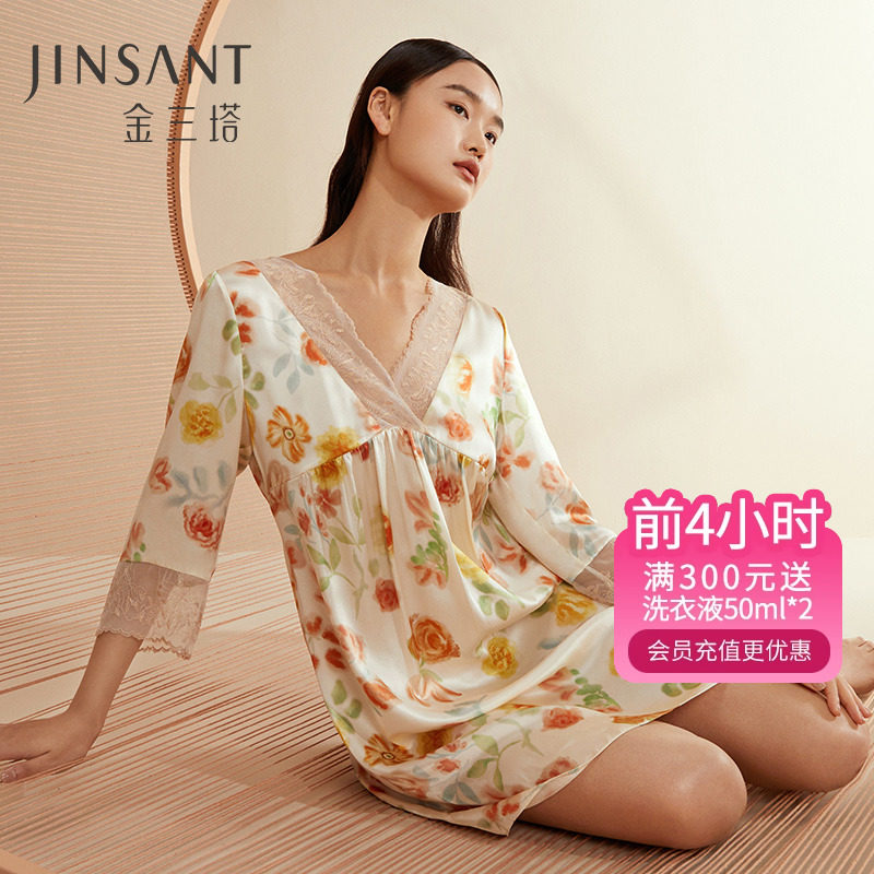 金三塔100%桑蚕丝真丝蕾丝拼接时尚甜美家居服女士睡裙23年新品