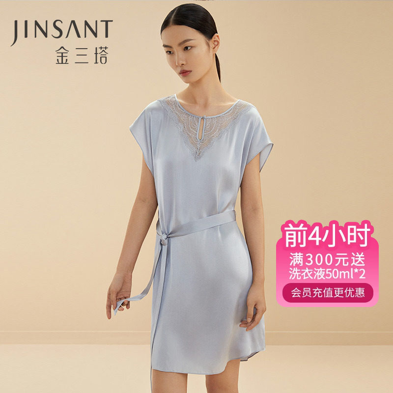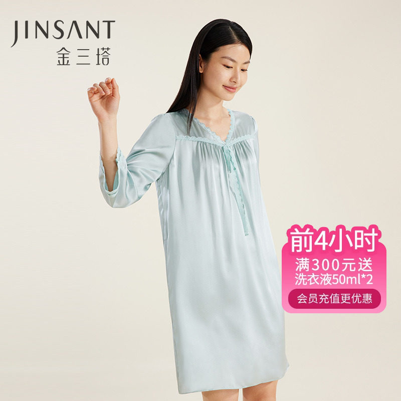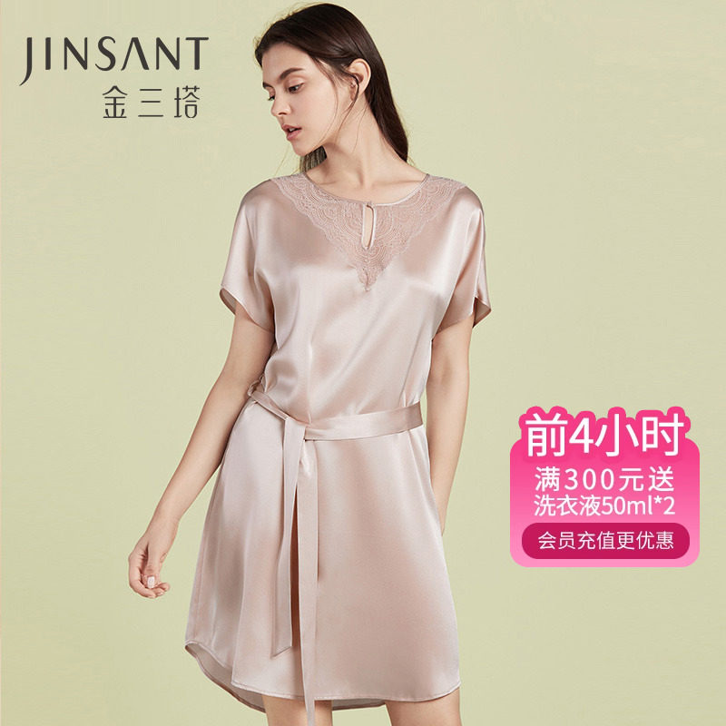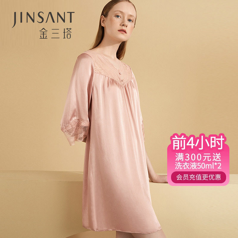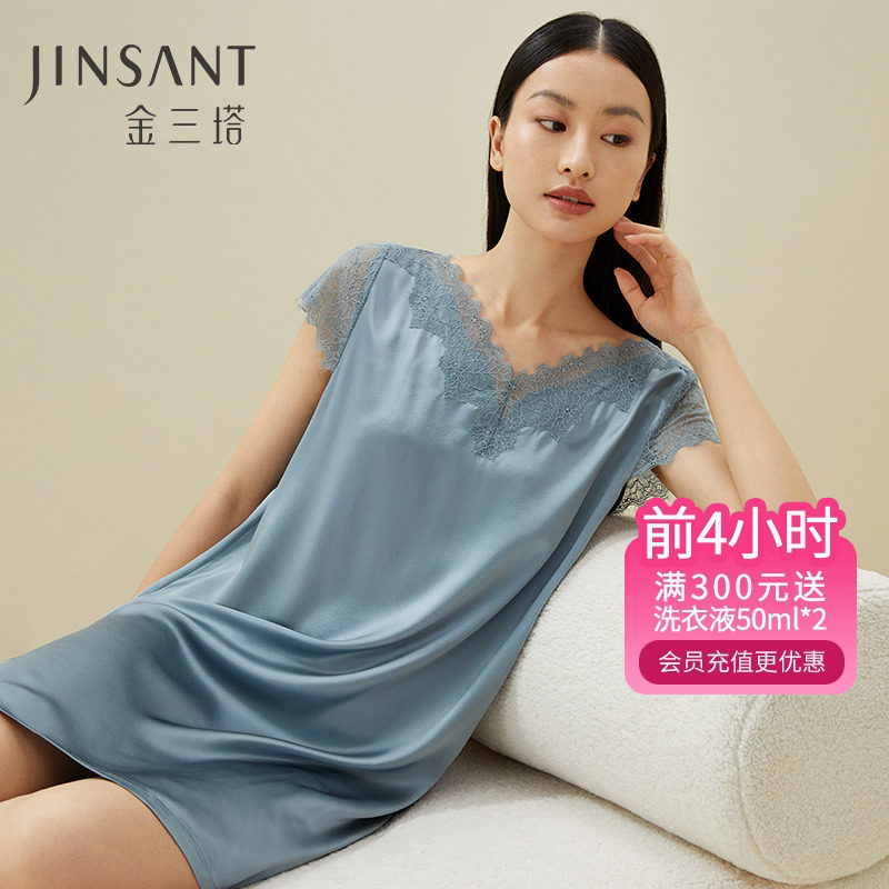 金三塔100%桑蚕丝睡裙女真丝蕾丝纯色舒适宽松丝绸睡衣新品