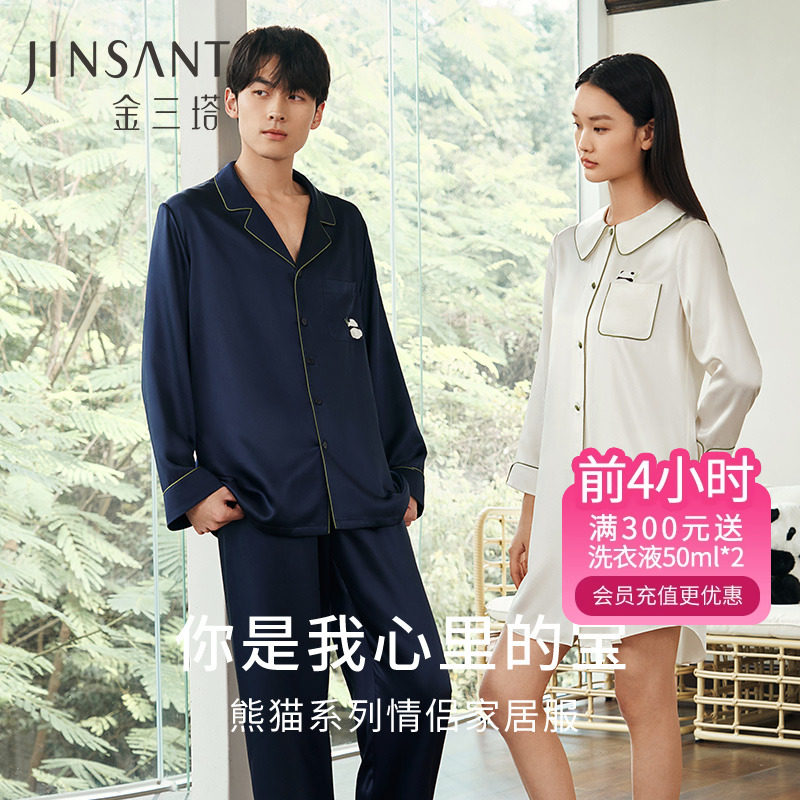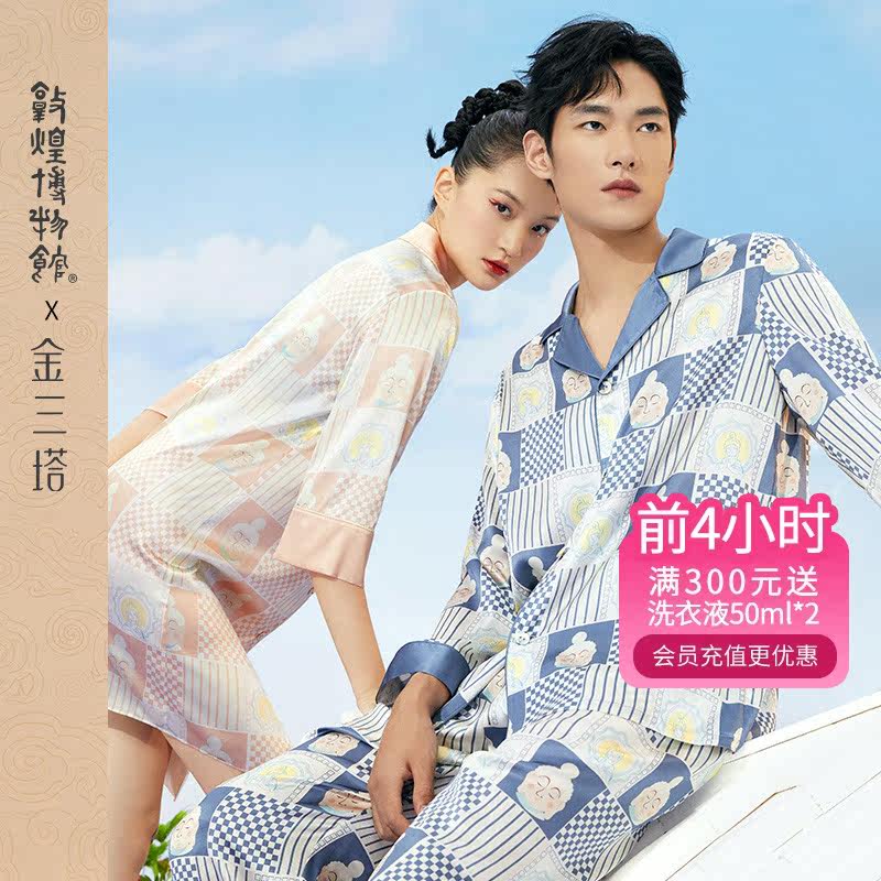 金三塔敦煌联名桑蚕丝弹力印花情侣家居服男士睡衣套装女士睡裙