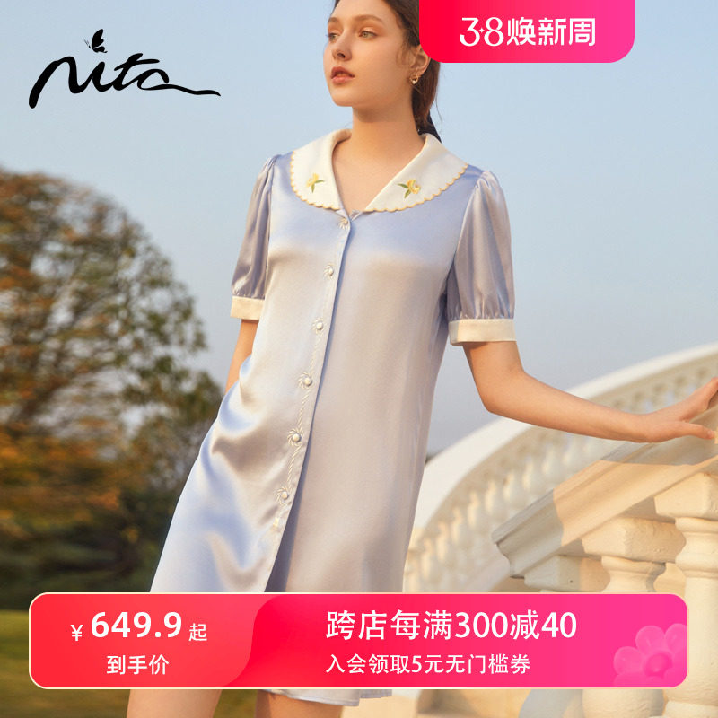 Nita妮塔真丝美肤睡裙女刺绣娃娃领泡泡袖睡衣宅家三公里家居服薄