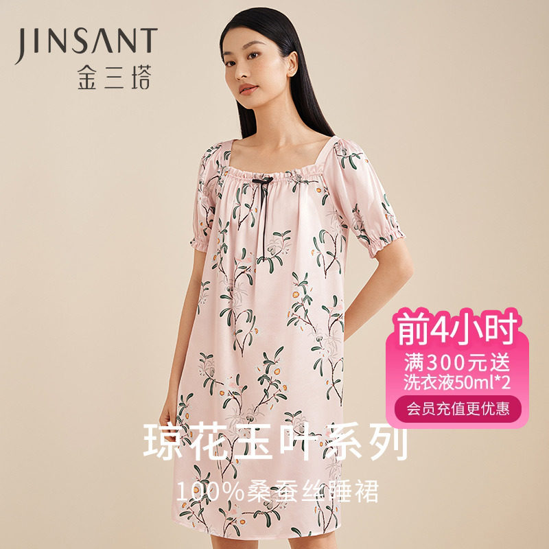 金三塔100%桑蚕丝 软糯 舒适女士粉色花朵印花睡裙春夏新品