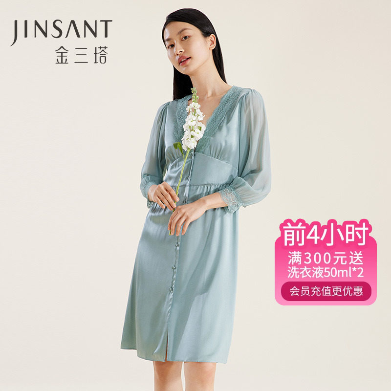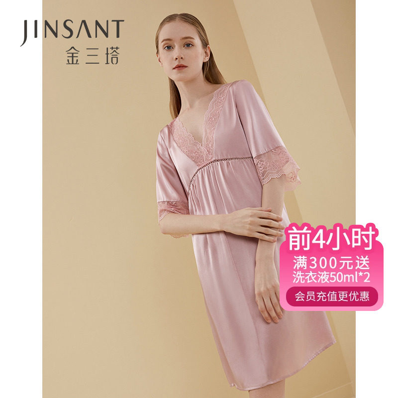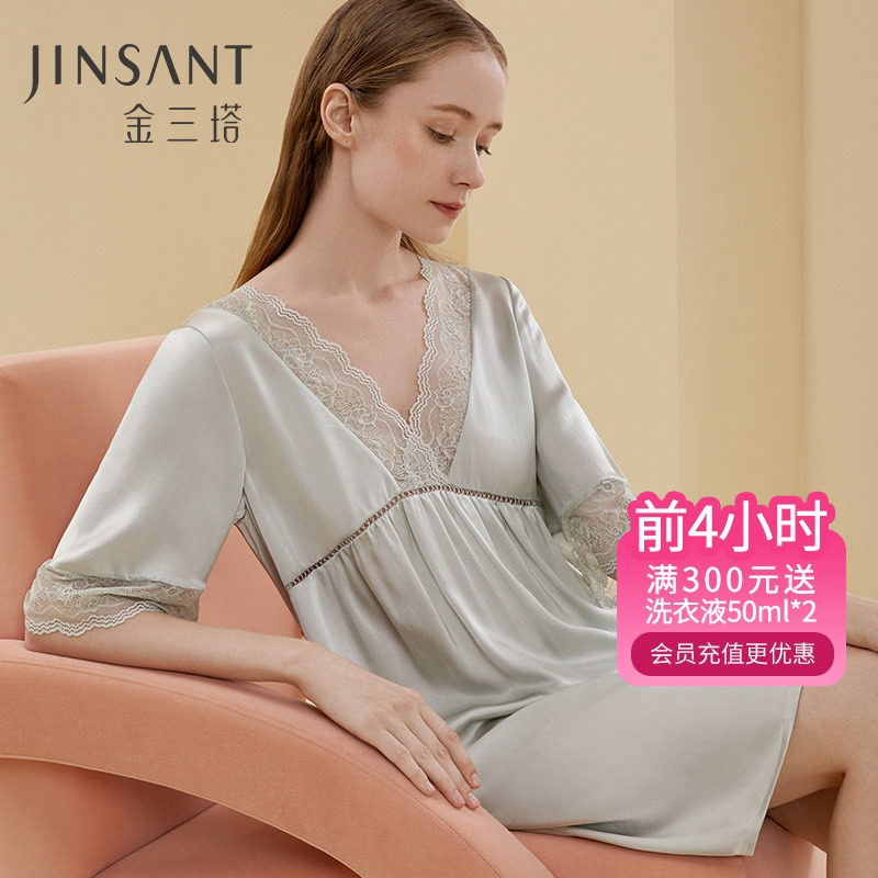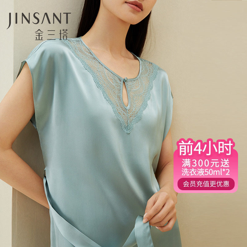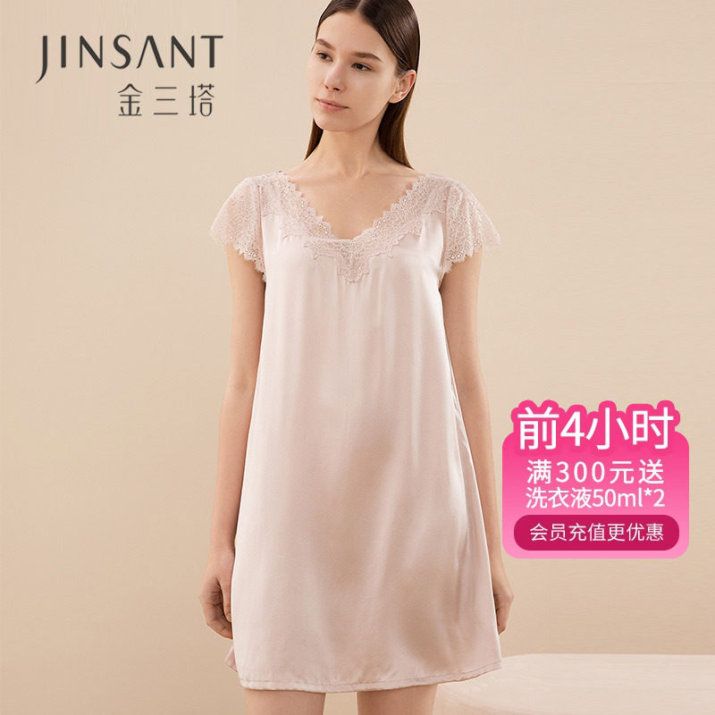 金三塔[100%桑蚕丝][丝滑舒适]真丝睡衣女性感V领蕾丝吊带睡裙子