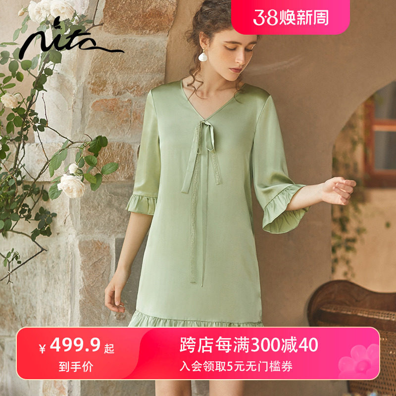 Nita妮塔法式V领睡裙100%桑蚕丝荷叶边七分袖宽松睡衣真丝家居服
