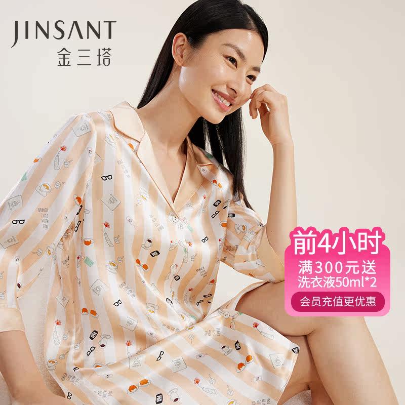 金三塔真丝印花睡裙女新品100%桑蚕丝条纹可外穿衬衫式睡衣
