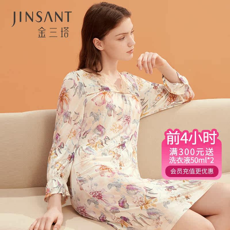 金三塔100%桑蚕丝舒适睡衣女士真丝印花拼刺绣蕾丝睡裙家居服新品