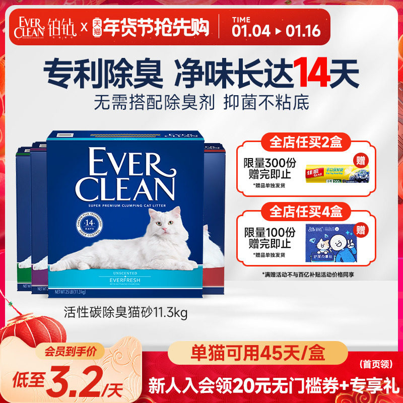 铂钻猫砂EverClean膨润土猫沙活性炭除臭满25磅包邮几近无尘矿砂