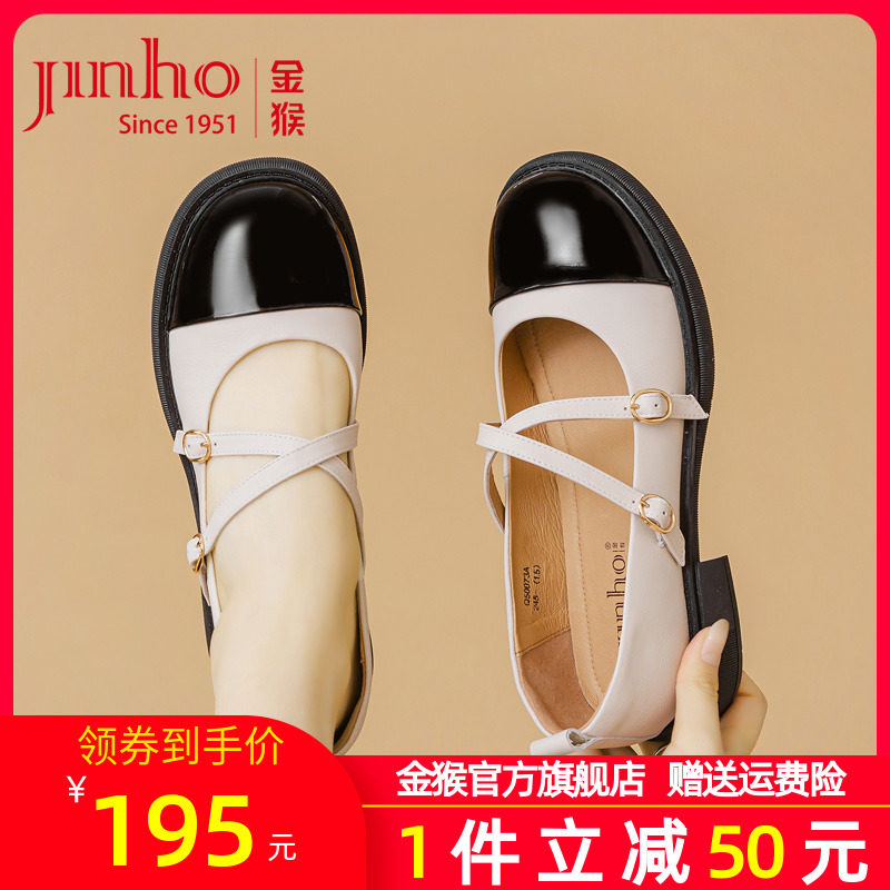 金猴女鞋2024春季新款黑白拼色玛丽珍鞋高跟复古单鞋小香风小皮鞋