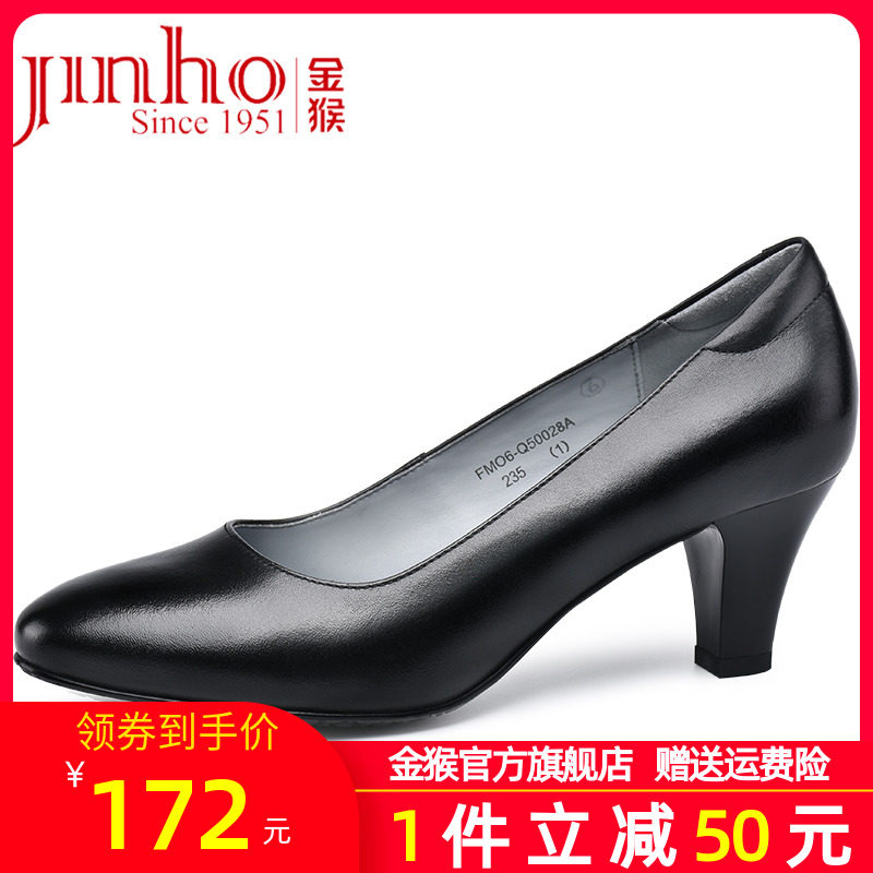 金猴官方旗舰女皮鞋女士通勤黑色尖头正装6cm高跟鞋粗跟皮鞋正品