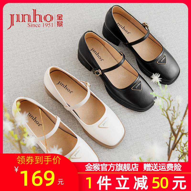 金猴官方旗舰店玛丽珍鞋2023秋季新款粗高跟白色时尚浅口小皮鞋女