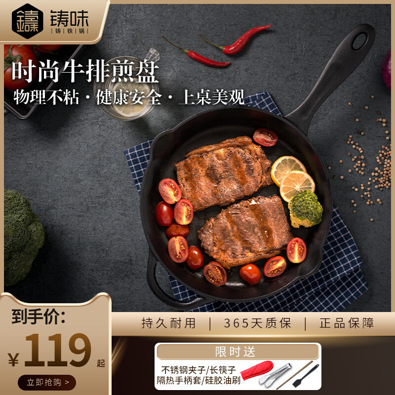 厂铸味23cm铸铁牛排煎锅家用少油烟不易粘锅无涂层平底锅煎锅烙品