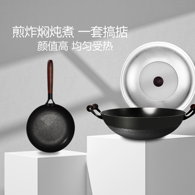 铸味铁锅无涂层炒菜锅锅具套装煎锅平底煎牛排专用不粘锅家用炒锅