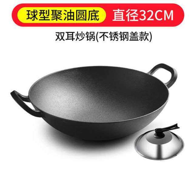 铸彩铸铁锅双耳铁锅家用不粘加深大炒菜锅圆底老式无涂层生铁炒锅