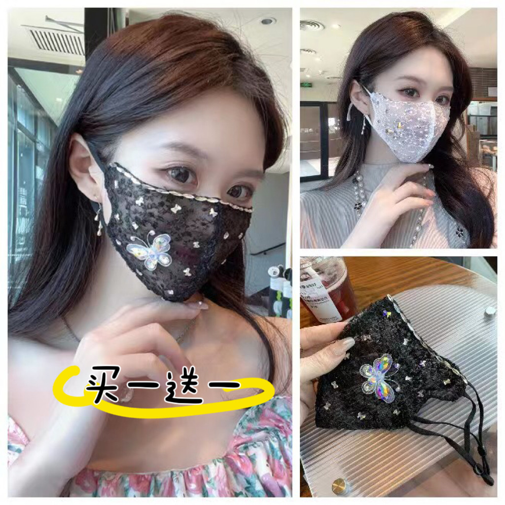 潮女出街拉风装饰口罩夏t季网红水晶蝴蝶闪亮防晒薄款蕾丝镶钻面