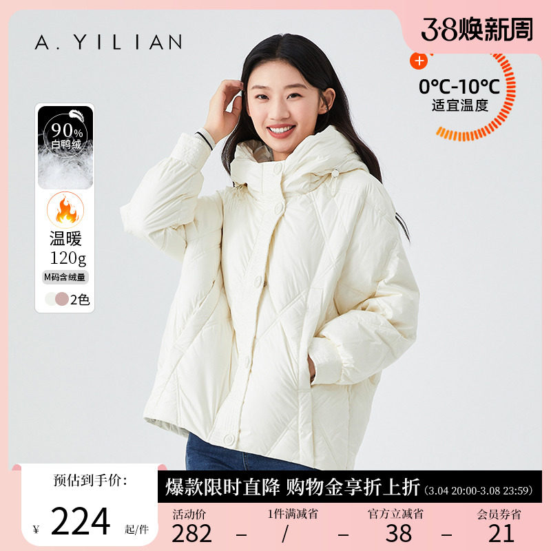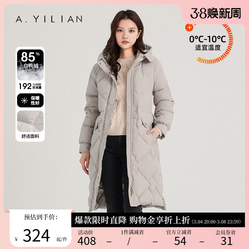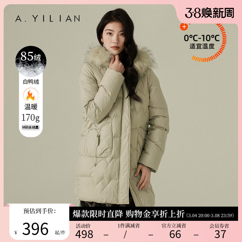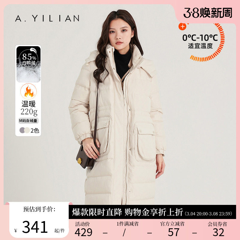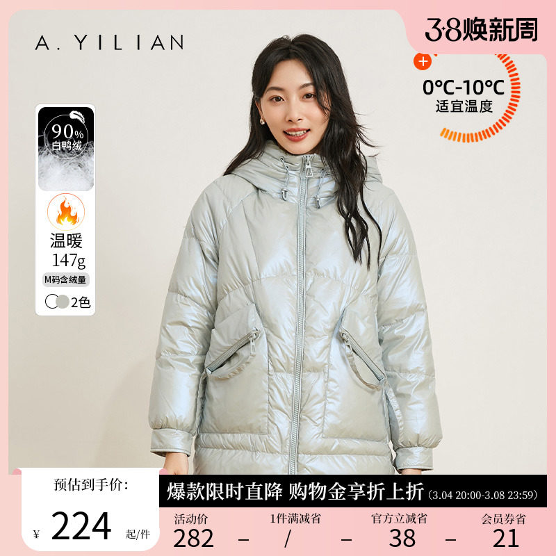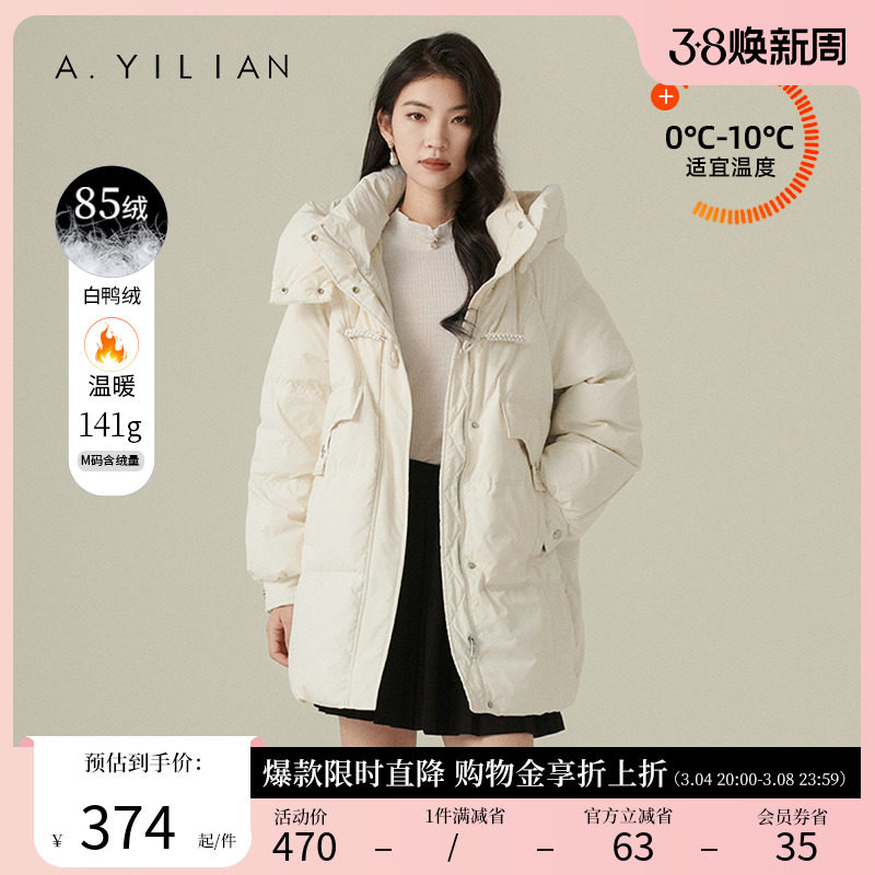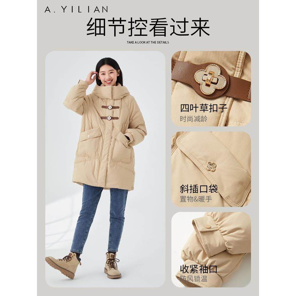 阿依莲2023冬季新款白鸭绒连帽中长款羽绒服女小个子立领羽绒外套