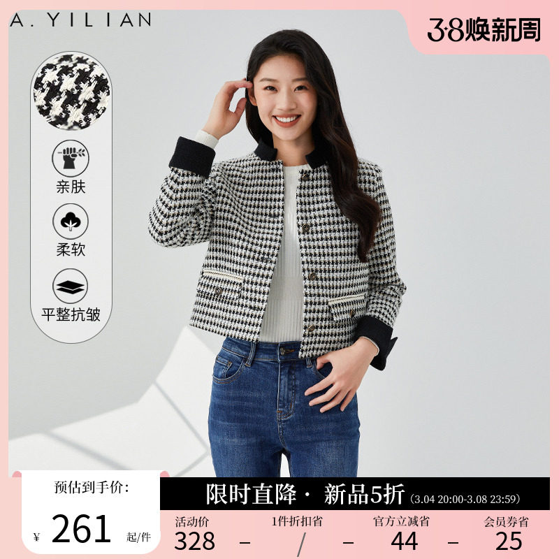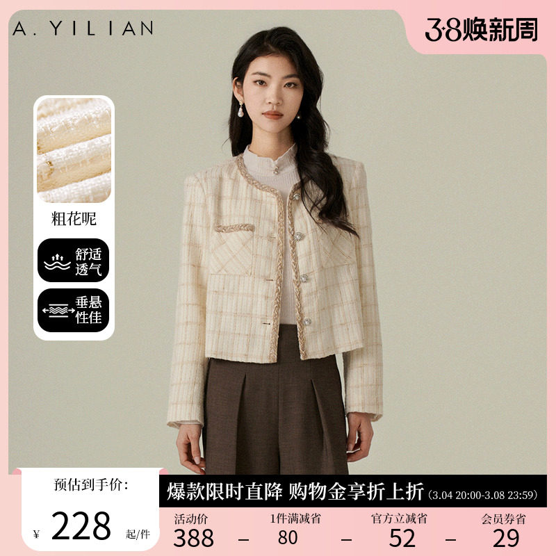 阿依莲2024春季新款粗花呢小香风短外套女复古圆领外套小个子上衣