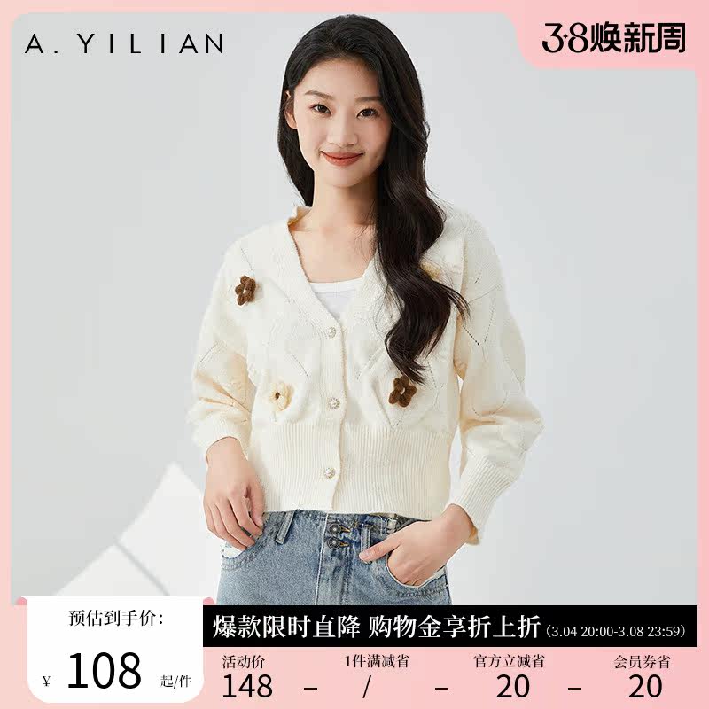 阿依莲女装春季2024新款立体小花朵甜美好看软糯针织开衫毛衣外套