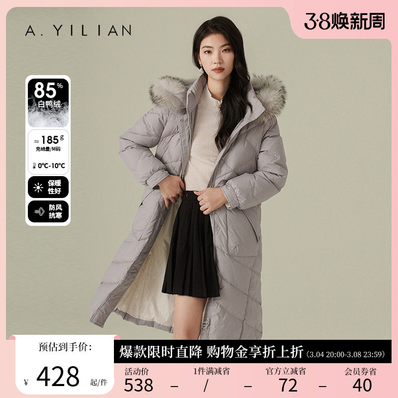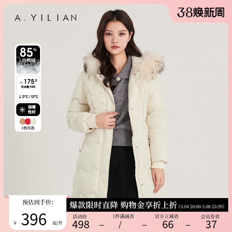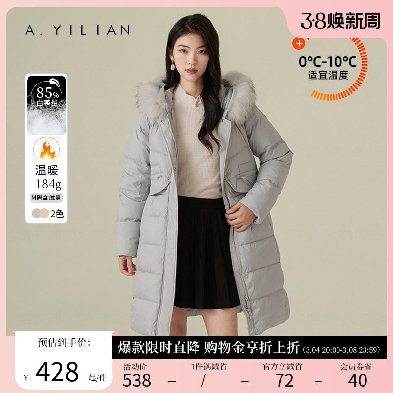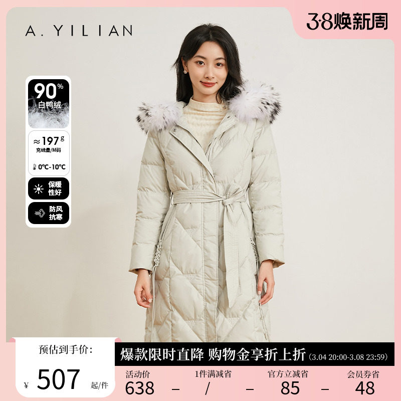 阿依莲2023新款中长款羽绒服女冬白鸭绒收腰连帽大毛领过膝厚外套