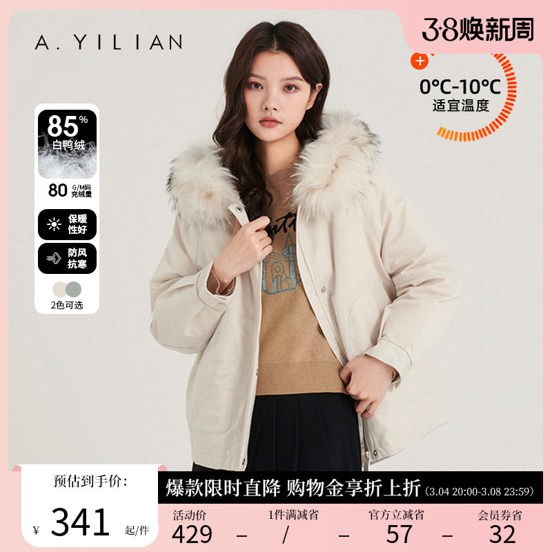 阿依莲2023新款短款羽绒服派克女冬小个子白鸭绒大毛领保暖厚外套