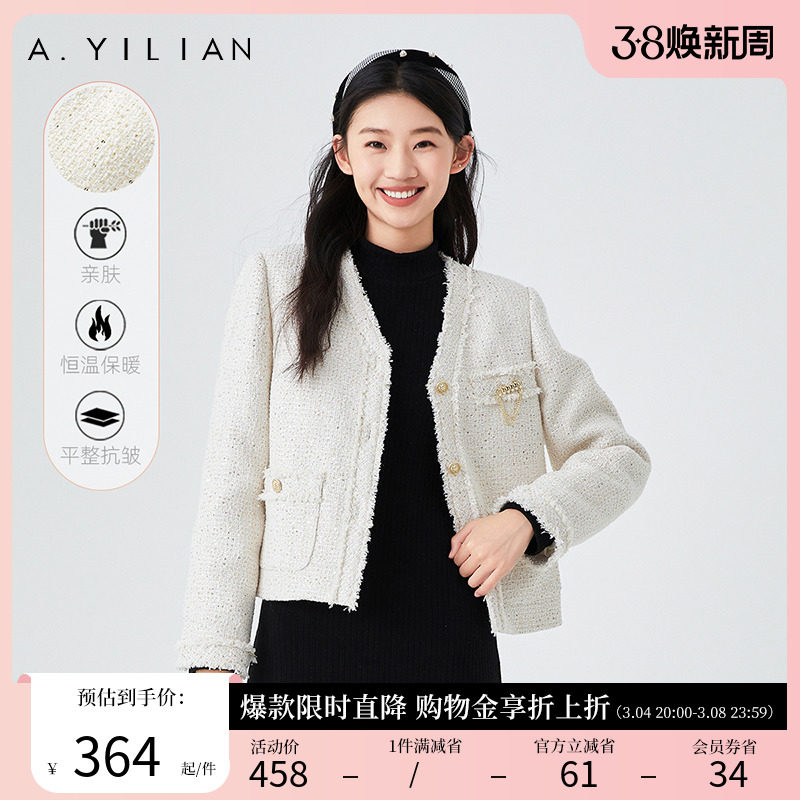 阿依莲2024春装小香风短外套女法式粗花呢毛边甜美通勤高级感外套