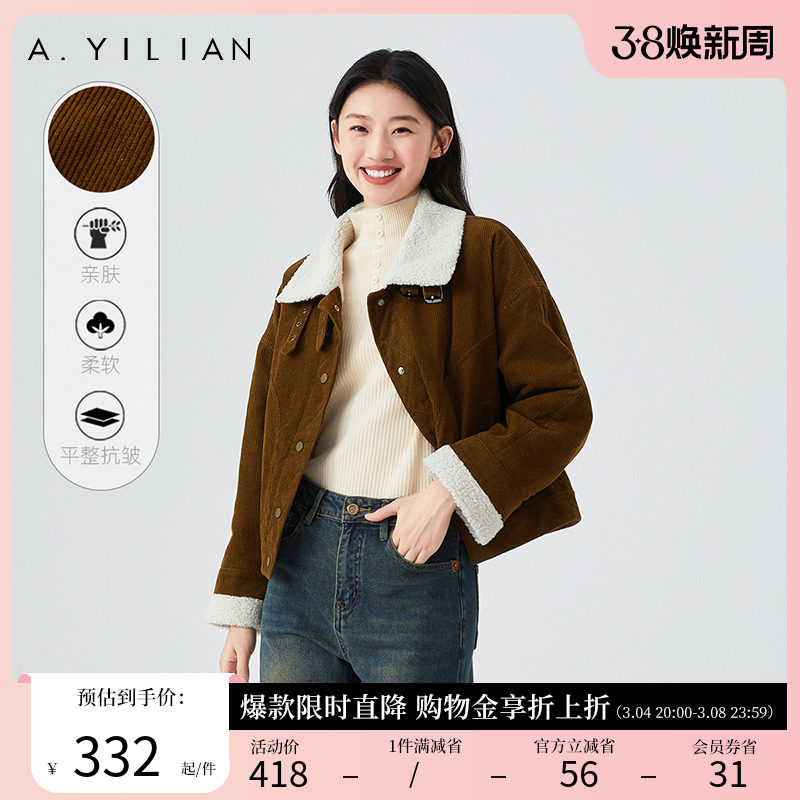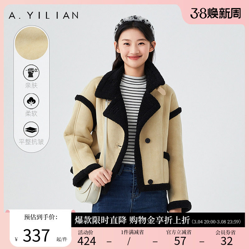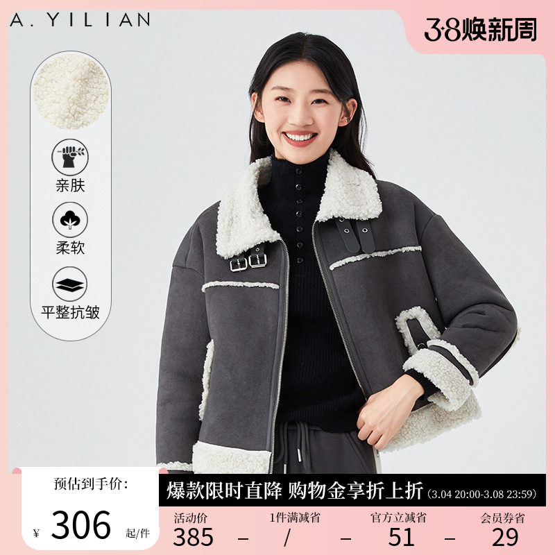 阿依莲皮毛一体短外套2024新款爆款春季拼接羊羔绒翻领棉服外套女