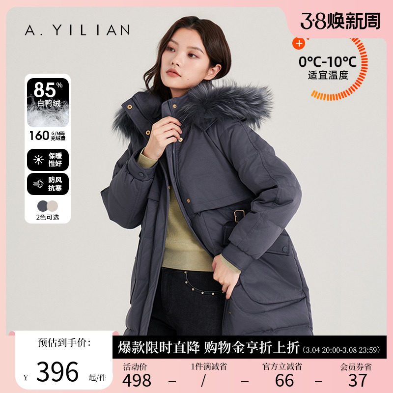 阿依莲2023新款中长款羽绒服女冬白鸭绒大毛领连帽收腰保暖厚外套
