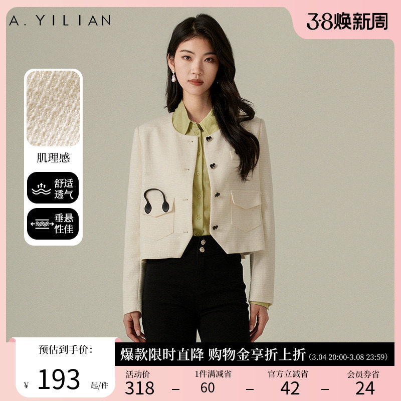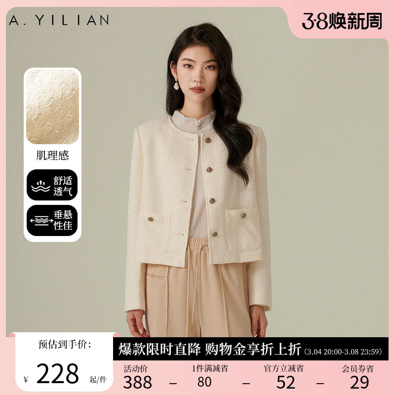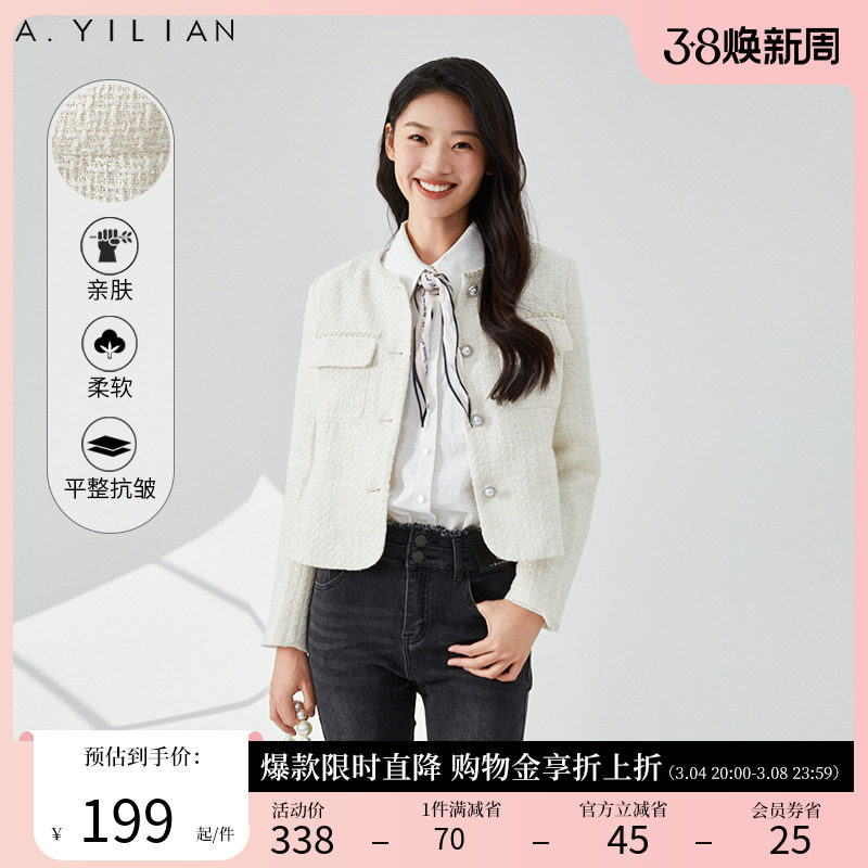 阿依莲2024春季新款小香风短外套法式粗花呢女装减龄上衣圆领外套