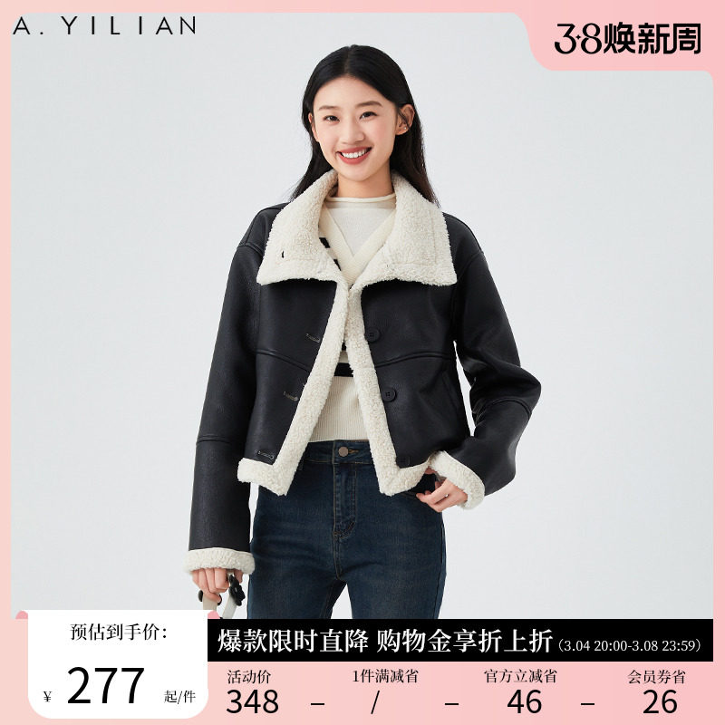 阿依莲皮毛一体拼接短款外套女春季款2024新款加厚羊羔毛夹克外套