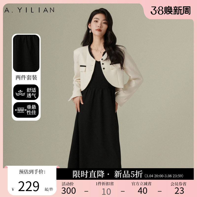 阿依莲2024春季新款小香风气质两件套女花边撞色外套搭收腰连衣裙