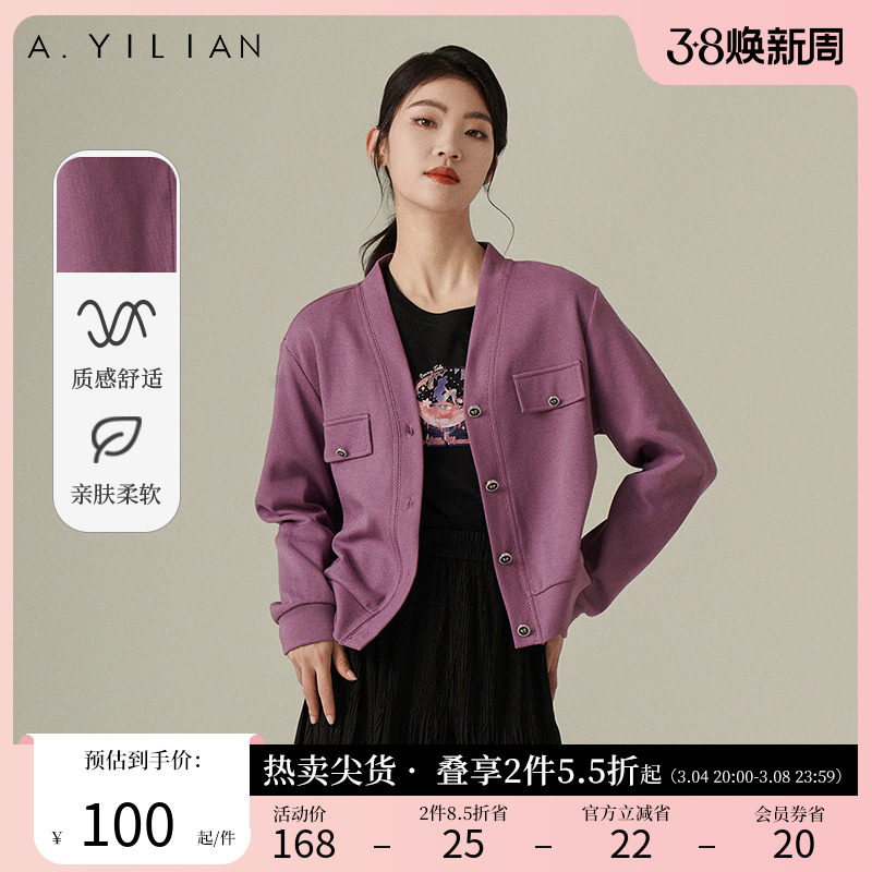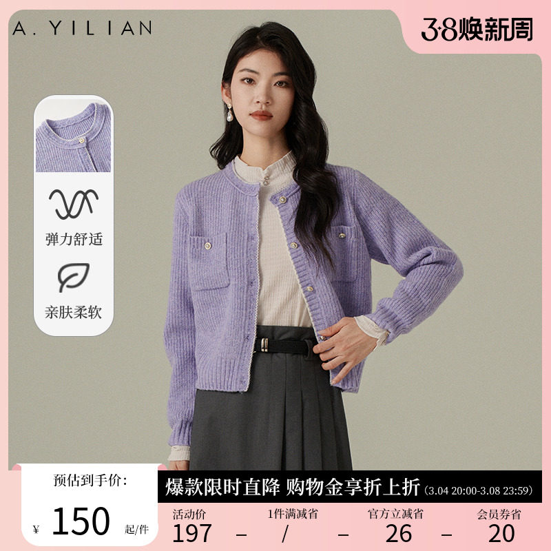 阿依莲温柔香芋紫毛织外套女2024新款春季小香风百搭显瘦毛衣上衣