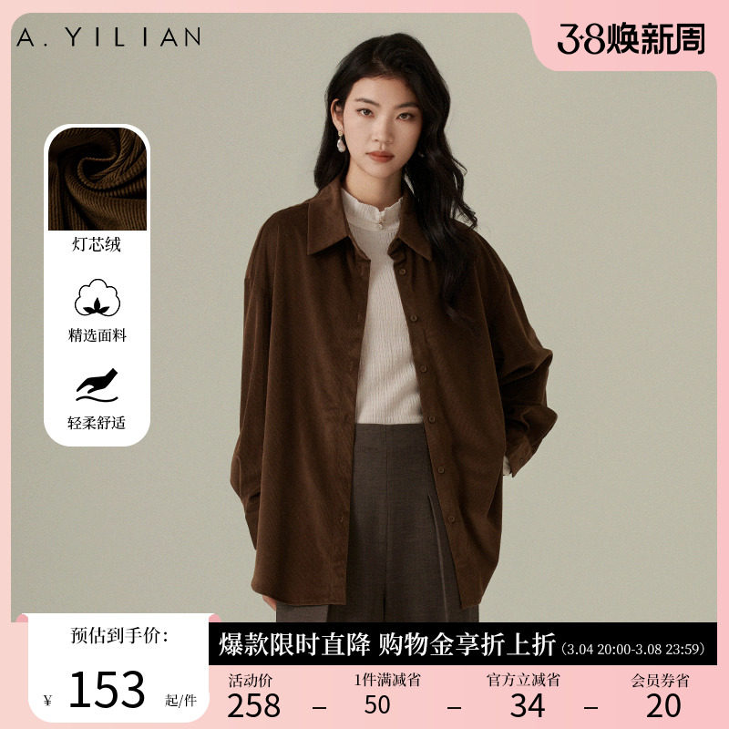 阿依莲复古灯芯绒衬衫女2024春季新款翻领叠穿宽松衬衣设计感外套