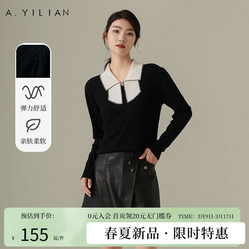 阿依莲翻领蝴蝶结长袖针织衫女2024春季新款设计感内搭打底衫毛衣