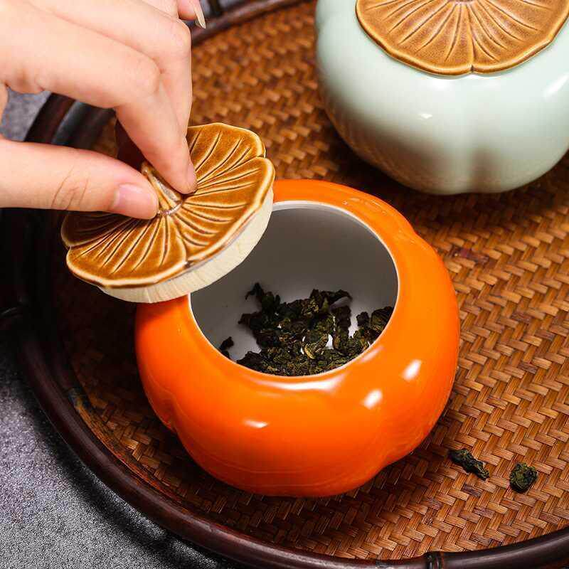 你迷南瓜茶叶罐陶瓷小号圆形密封罐小瓷罐木制礼盒装礼品定制