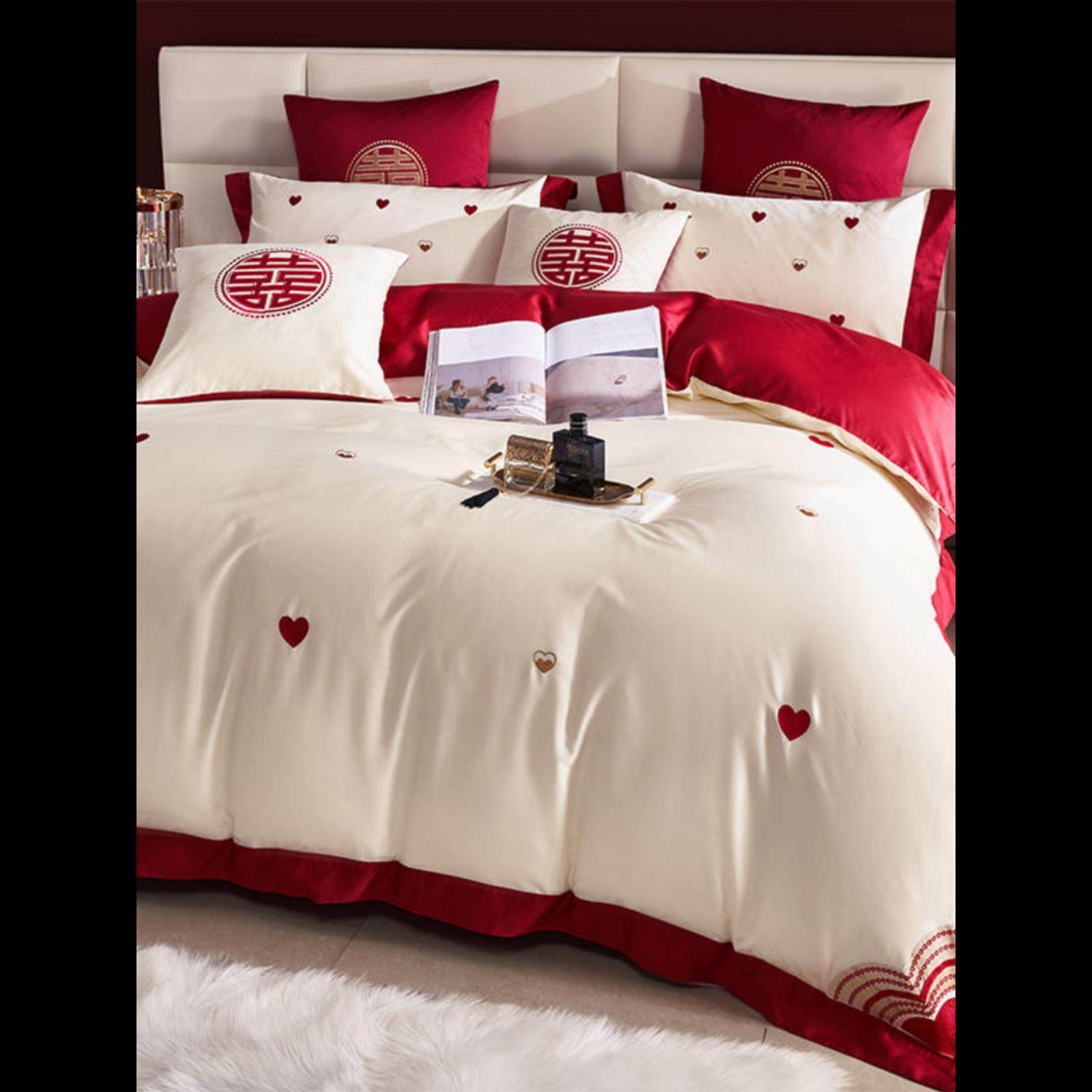 雅兰家纺婚庆婚房刺绣纯棉高档全棉欧式床上用品结婚被套红色四件